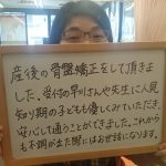 2019年5月9日 / 最終更新日 : 2025年9月16日 nekozane お喜びの声 【お喜びの声】産後骨盤矯正 妊娠中から困っていた腰痛が産後ひどくなり診て頂くようになりました。産後の骨盤矯正の必要性や今の身体の状態など、いつも丁寧に説明して下さり分かりやすかったです。子供もみていて頂け、安心して通うことができました。友達にもスス […]